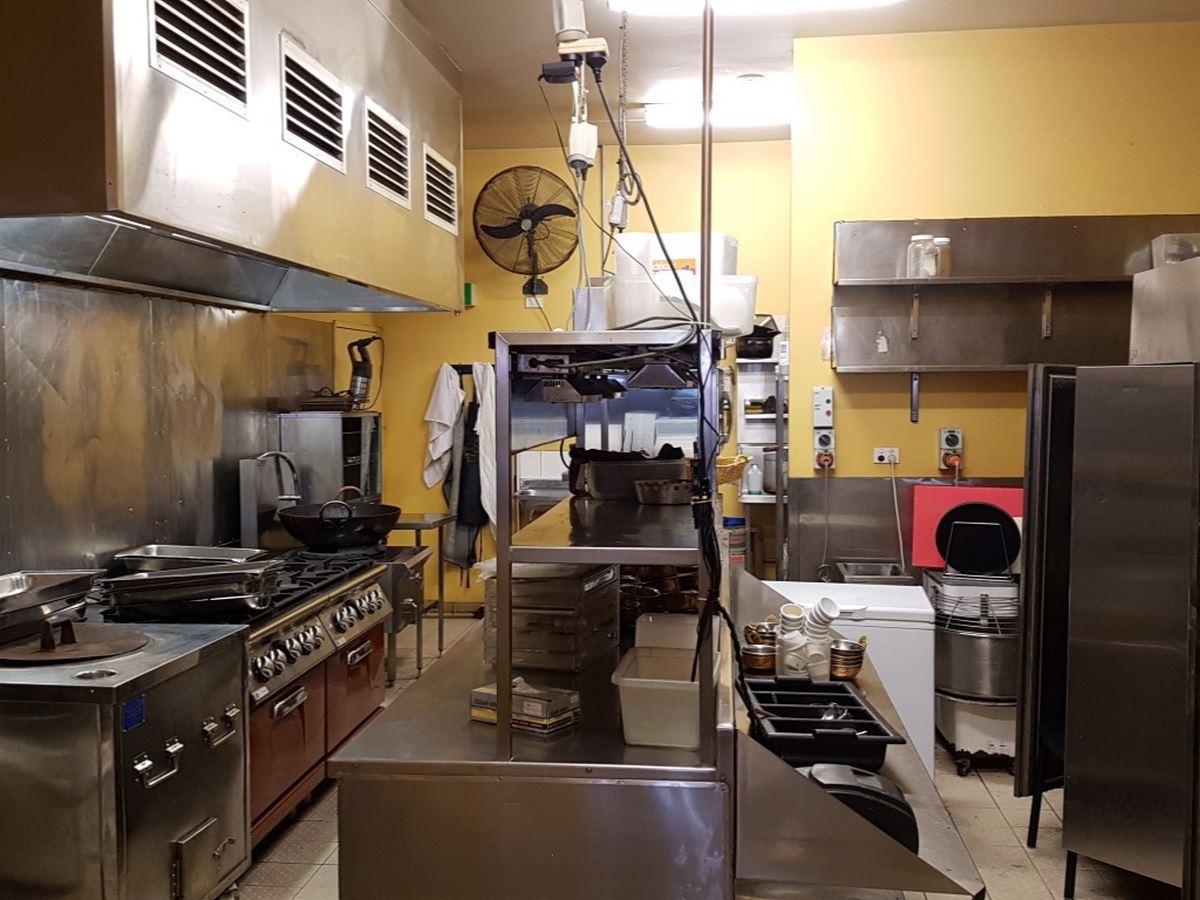Large commercial kitchen equipped with stainless steel fixtures and canopy exhaust fans