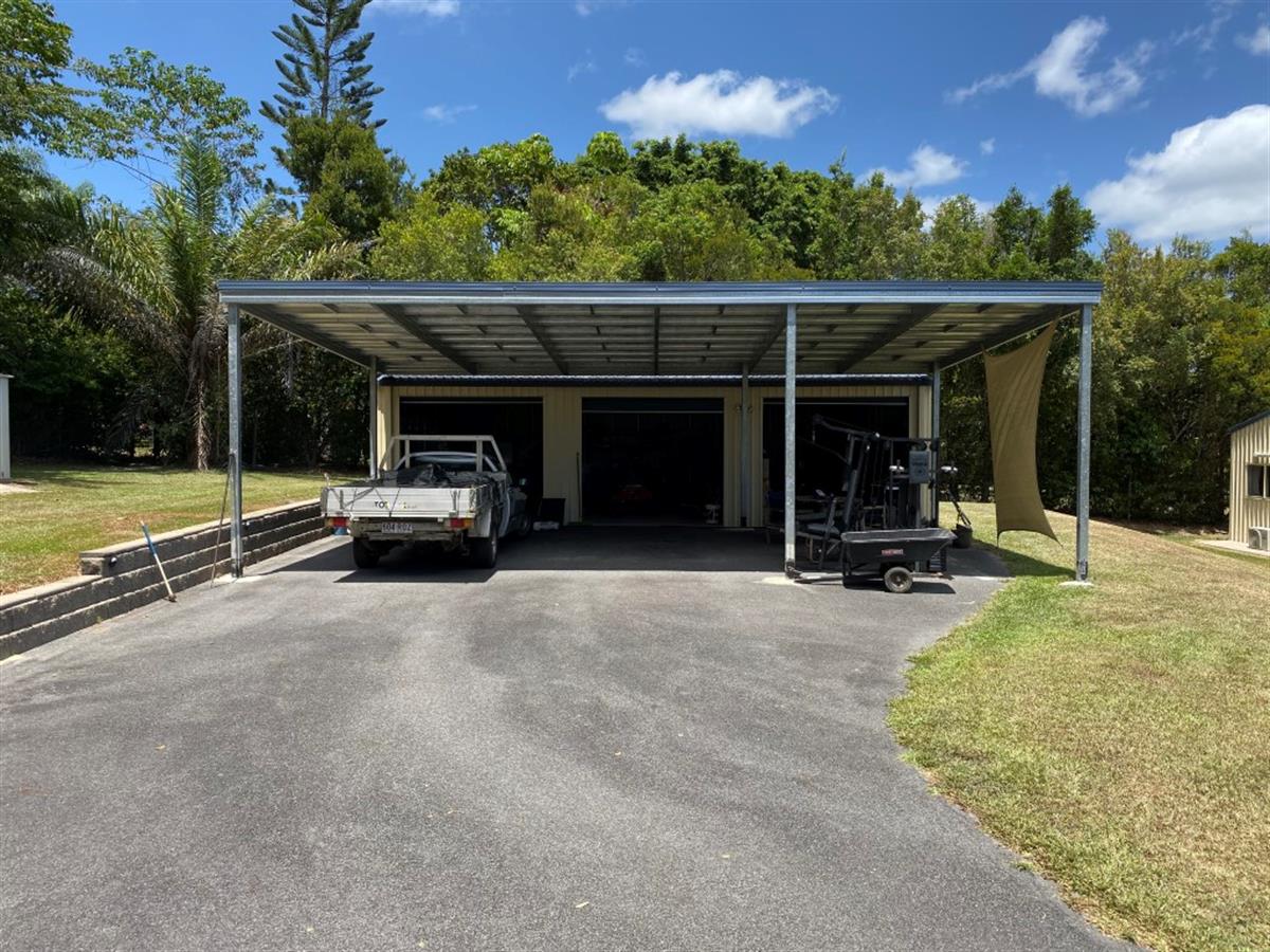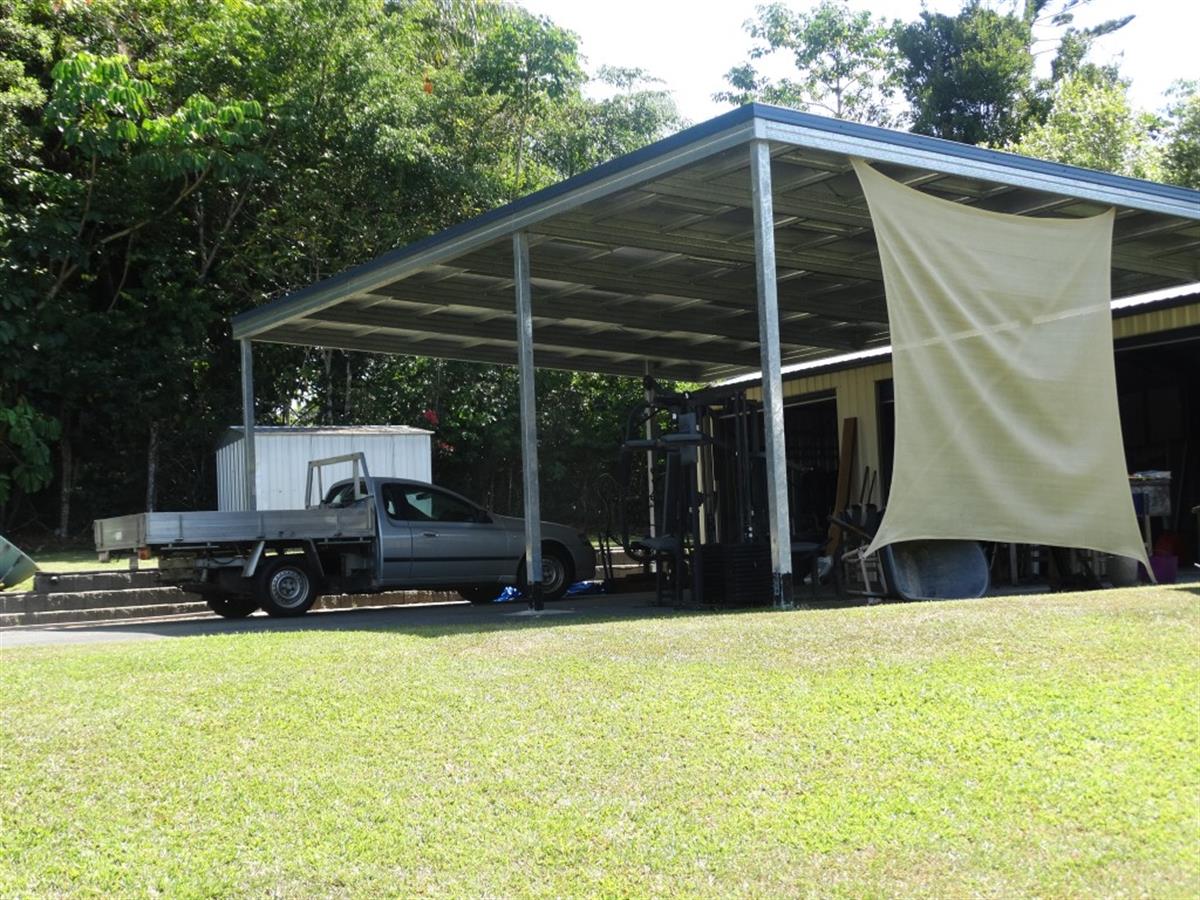 3 bay shed and 3 bay carport with extra high roof make a perfect place to park your caravan or boat.
