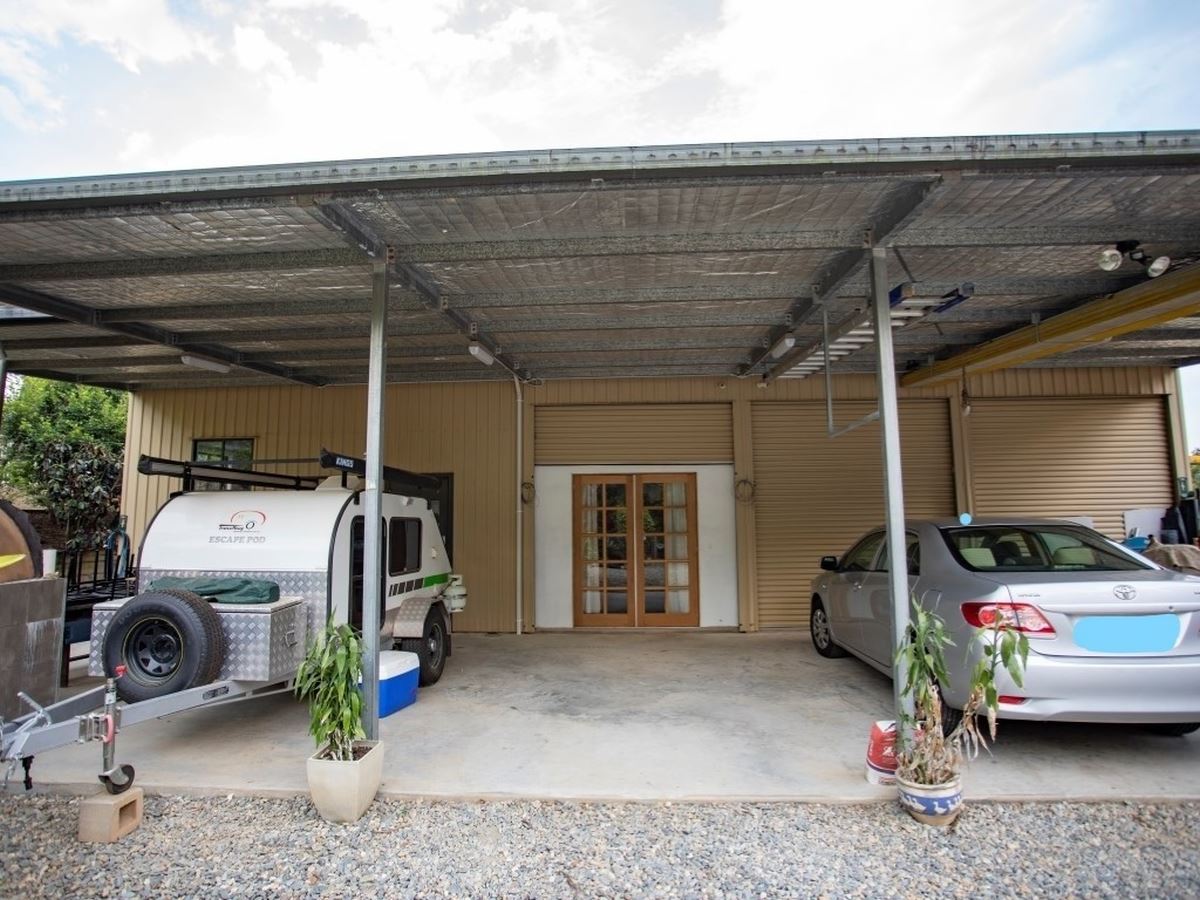The shed house consists of a 5 bay shed, 3 of which have been converted to a granny flat. Self-contained, 3 bedrooms, bathroom/laundry and kitchenette/ living area. It's air conditioned and has its own gas hot water supply with gas cook-top oven. A brilliant Grandparents stay, extra family accommodation or great for adult teen kids to be close to home. This extra space is also perfect for a business office or art studio. Two very large bays of the shed are allocated for the man cave and tradies delight.